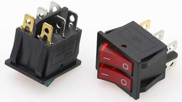 Այս երկտեղանոց կոճակային անջատիչը (Double Rocker Switch) թույլ է տալիս մեկ իրանի մեջ ունենալ երկու անկախ կառավարվող կոճակ: Այն ունի 6 կոնտակտ (ոտիկ), ինչը նշանակում է, որ յուրաքանչյուր կոճակ ունի իր առանձին 3 կոնտակտները՝ հնարավորություն տալով կառավարել երկու տարբեր սարքեր կամ ֆունկցիաներ միաժամանակ:
